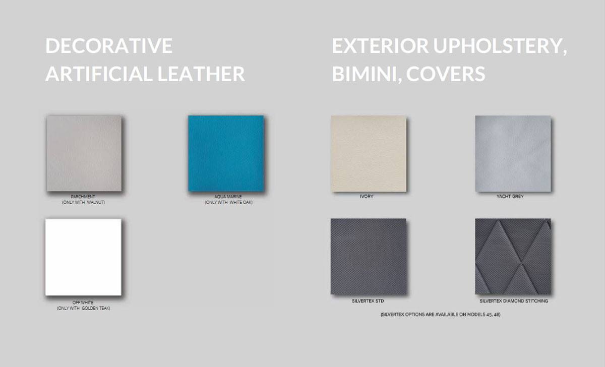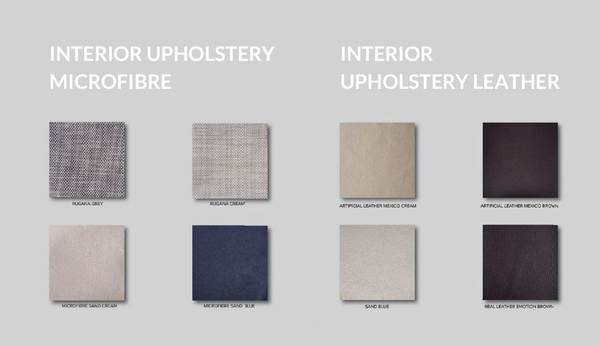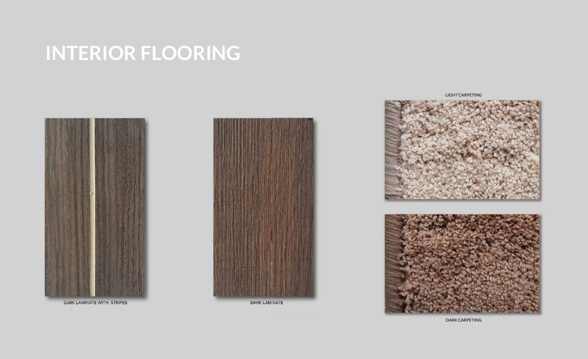 On this page you will see the variety of options to create a home away from home. Options provided for your comfort and personal esthetics are exterior finish, interior wood, flooring, countertop, fabric, and upholstery.