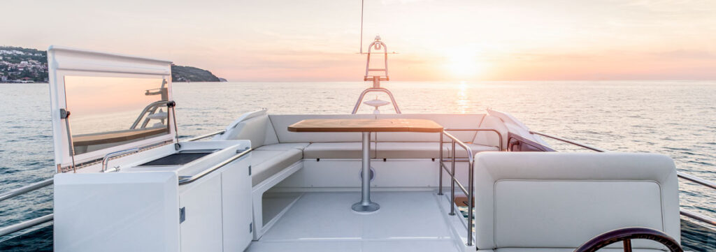 Two teak steps on both the port and starboard side access the cockpit. Transom seating, (with access to a stowage locker under the cushions, combines with a fixed pedestal table to enable outdoor entertaining. The large flybridge extends over the cockpit, offering some shelter from the elements on a hot sunny day or during a passing shower.