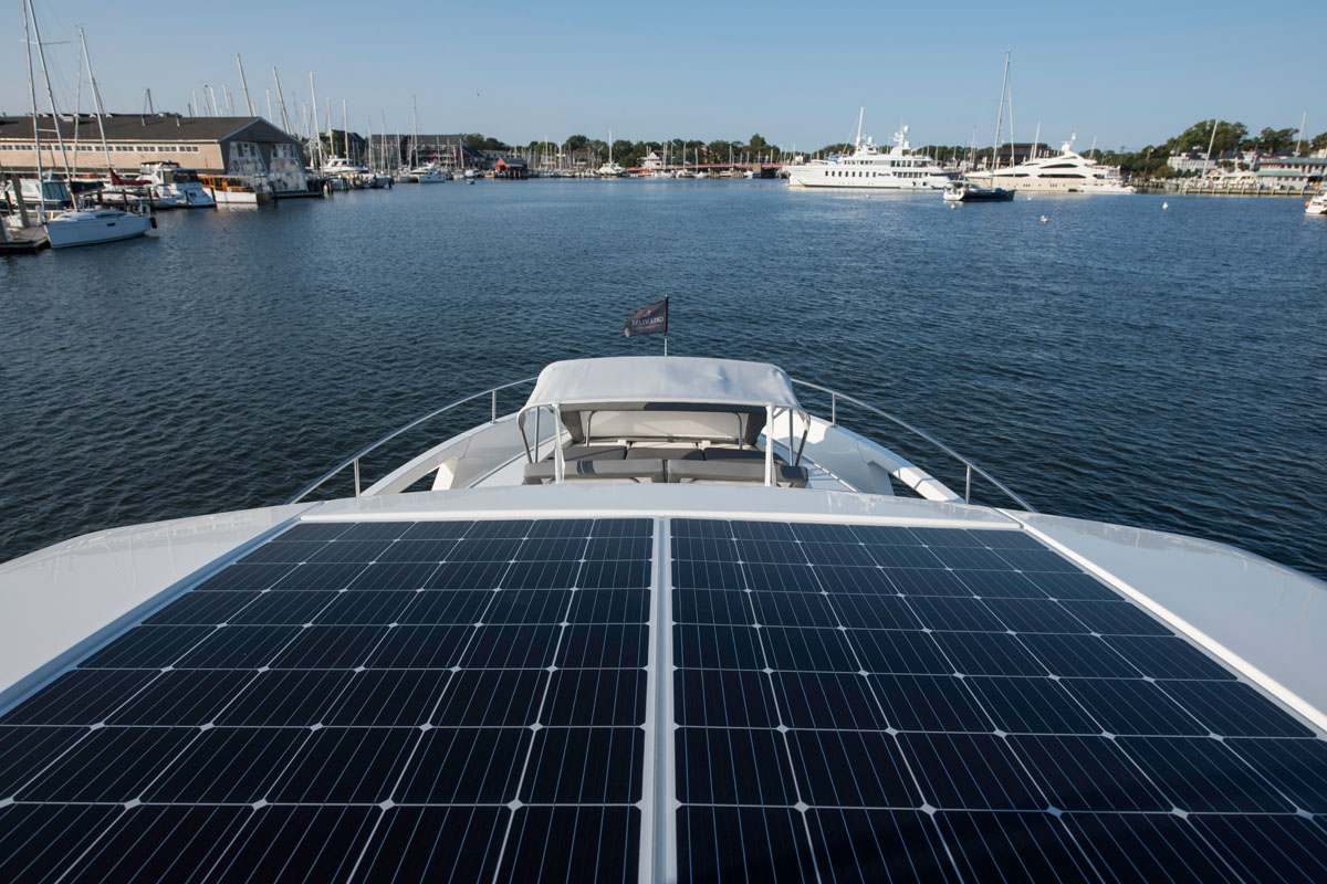 Most Greenline 45 Flybridge hybrid yachts will be ordered without an auxiliary generator. The large battery banks, recharged by solar panels, will typically prove adequate to power lights, appliances, water pumps, etc. aboard the boat for a weekend at anchor.