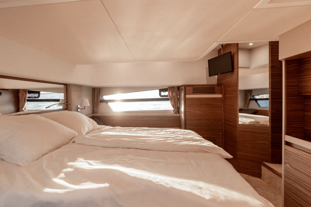 On the two-stateroom model, guests in the VIP stateroom will enjoy a large, “walk in” hanging locker on the starboard side. There’s an identical feature, also to starboard, for the master stateroom, located midships. This pair of stowage areas on the Greenline 45 Flybridge hybrid are possibly the largest amenity of this type on any 45-foot vessel.
