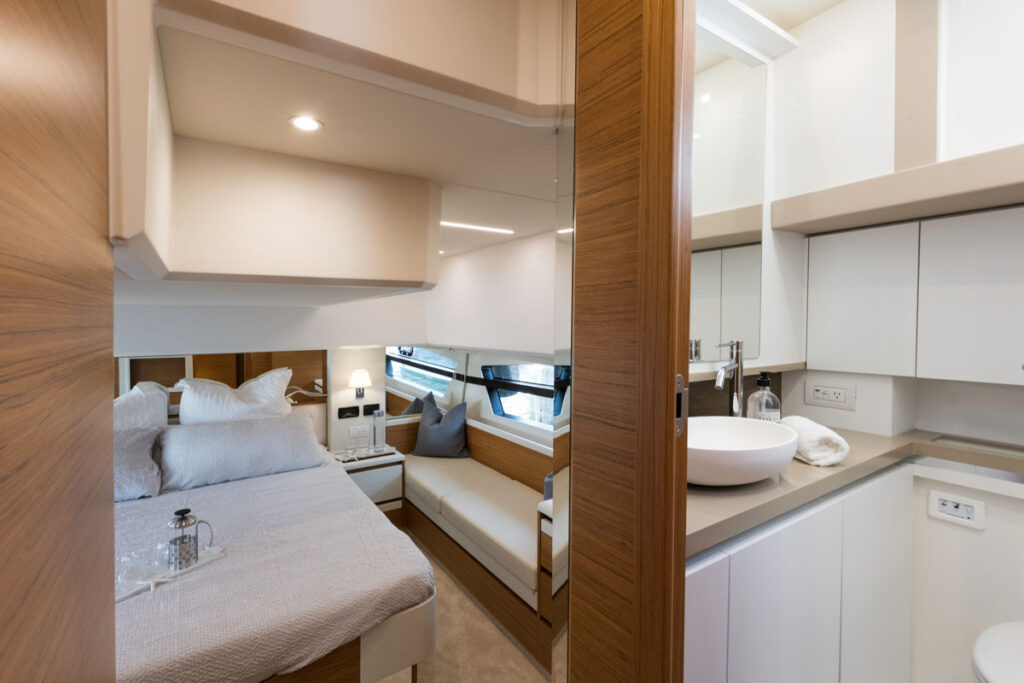 One the lower deck, the Greenline 45 Flybridge hybrid is available in either two or three stateroom layouts. Down companionway steps from the main cabin are rows of matching doors. Opening the door farthest forward gains entry to the VIP stateroom. A walk around bunk is on centerline, with seating a stowage options on either side. Greenline is noted for introducing a great deal of natural light on the lower decks, and the 45 Flybridge hybrid is no exception. There’s no sensation of being “down in a hole” in any of the staterooms.